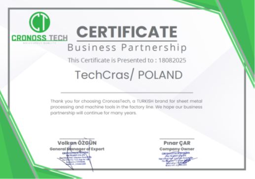 Cronosstech działa w oparciu o wizję skoncentrowaną na strategicznej współpracy na arenie globalnej w zakresie maszyn do obróbki blach i obrabiarek. Silne relacje nawiązane międzynarodowymi partnerami, wzmacniają zaangażowanie w dostarczanie Klientom produktów najwyższej jakości na całym świecie.